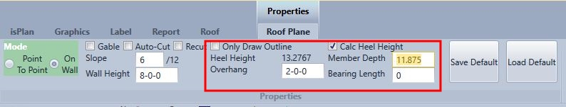A user can use Calc Heel Height to calculate their Heel Height to apply to the Fixed Heel Height field or the software will calculate it automatically by leaving Calc Heel Height on. A user must input the member depth and if they would like a bearing length they must input that dimension as well in decimal inches.