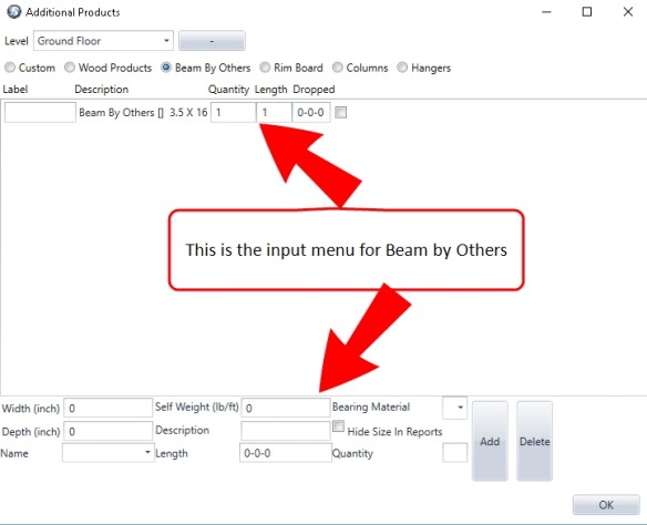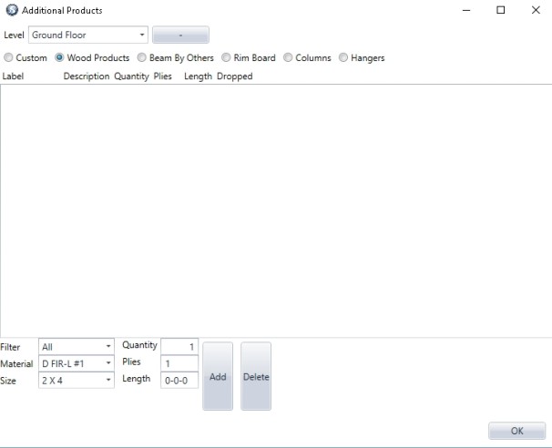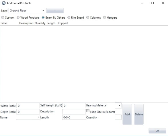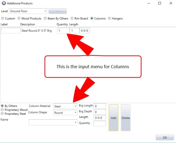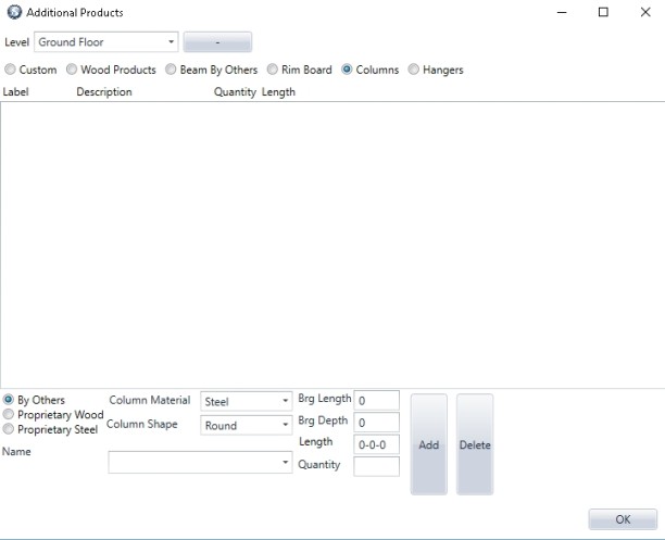 These additional Column products (Proprietary Wood) are part of the current Materials List that the user uses for design and engineering of a framing plan/layout. It also can add By Others and Proprietary Steel to the Reports as well.