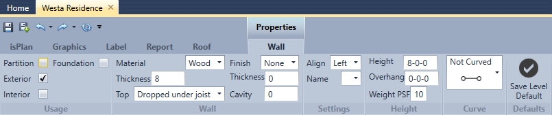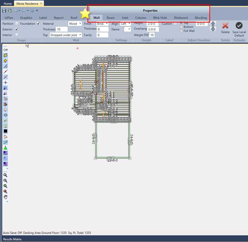 Selecting multiple or single walls, beams, joists, columns, rim or other framing items create a tab at the top for editing« . Selecting a specific properties tab will allow users to edit a singular or multiple walls, beams joists, columns, rim etc.