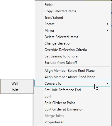 Many execution commands are performed with a right click. For example see below image. If users want to input a single wall and then decide to continue you would use the add walls command. If users are done with the command they can click finish or esc, or users can just click on another input item. Ex: beams, joist, rim.