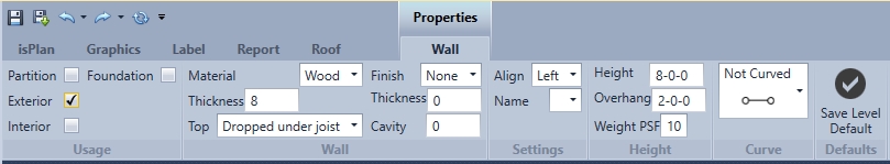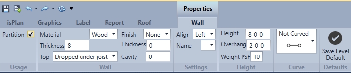 Overhang- This tells the software that an overhang is to be applied when drawing roofs. Distance from outside edge of wall to end of roof plane defines the overhang.